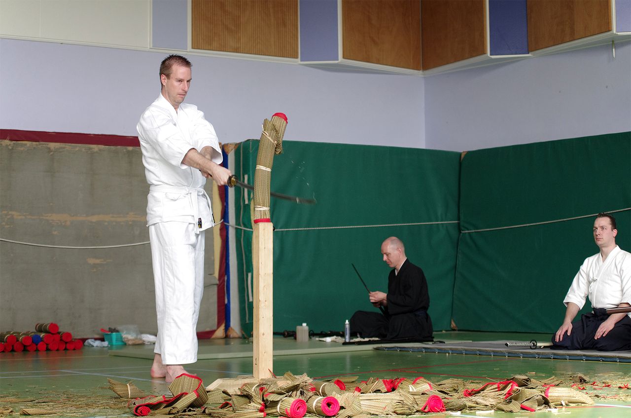 Op zondag 14 april hebben 8 deelenemers van allerlei niveaus (ook zonder enige ervaring) zelf rijst-stro matten gesnijden met een katana (samoeraizwaard). Er kon gebruik worden gemaakt van een leen-zwaard van de dōjō, maar enkele deelnemers hadden zelf een katana en mochten deze (na een korte inspectie) gebruiken om te snijden.